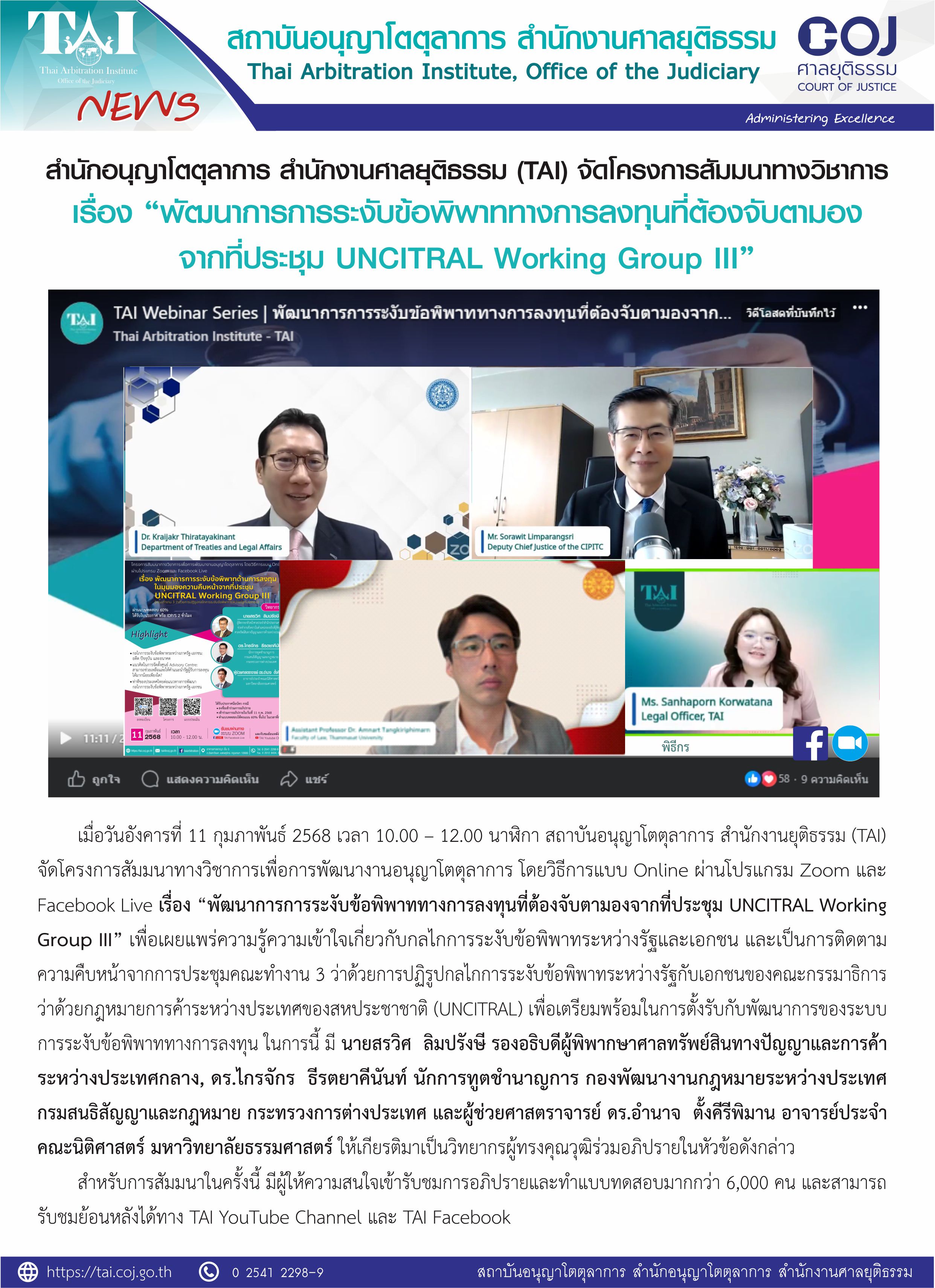 เมื่อวันอังคารที่ 11 กุมภาพันธ์ 2568 เวลา 10.00 – 12.00 นาฬิกา สถาบันอนุญาโตตุลาการ สำนักงานยุติธรรม (TAI) จัดโครงการสัมมนาทางวิชาการเพื่อการพัฒนางานอนุญาโตตุลาการ โดยวิธีการแบบ Online ผ่านโปรแกรม Zoom และ Facebook Live เรื่อง “พัฒนาการการระงับข้อพิพาททางการลงทุนที่ต้องจับตามองจากที่ประชุม UNCITRAL Working Group III” เพื่อเผยแพร่ความรู้ความเข้าใจเกี่ยวกับกลไกการระงับข้อพิพาทระหว่างรัฐและเอกชน และเป็นการติดตามความคืบหน้าจากการประชุมคณะทำงาน 3 ว่าด้วยการปฏิรูปกลไกการระงับข้อพิพาทระหว่างรัฐกับเอกชนของคณะกรรมาธิการว่าด้วยกฎหมายการค้าระหว่างประเทศของสหประชาชาติ (UNCITRAL) เพื่อเตรียมพร้อมในการตั้งรับกับพัฒนาการของระบบการระงับข้อพิพาททางการลงทุน ในการนี้ มี นายสรวิศ ลิมปรังษี รองอธิบดีผู้พิพากษาศาลทรัพย์สินทางปัญญาและการค้าระหว่างประเทศกลาง, ดร.ไกรจักร ธีรตยาคีนันท์ นักการทูตชำนาญการ กองพัฒนางานกฎหมายระหว่างประเทศ กรมสนธิสัญญาและกฎหมาย กระทรวงการต่างประเทศ และผู้ช่วยศาสตราจารย์ ดร.อำนาจ ตั้งคีรีพิมาน อาจารย์ประจำคณะนิติศาสตร์ มหาวิทยาลัยธรรมศาสตร์ ให้เกียรติมาเป็นวิทยากรผู้ทรงคุณวุฒิร่วมอภิปรายในหัวข้อดังกล่าว สำหรับการสัมมนาในครั้งนี้ มีผู้ให้ความสนใจเข้ารับชมการอภิปรายและทำแบบทดสอบมากกว่า 6,000 คน